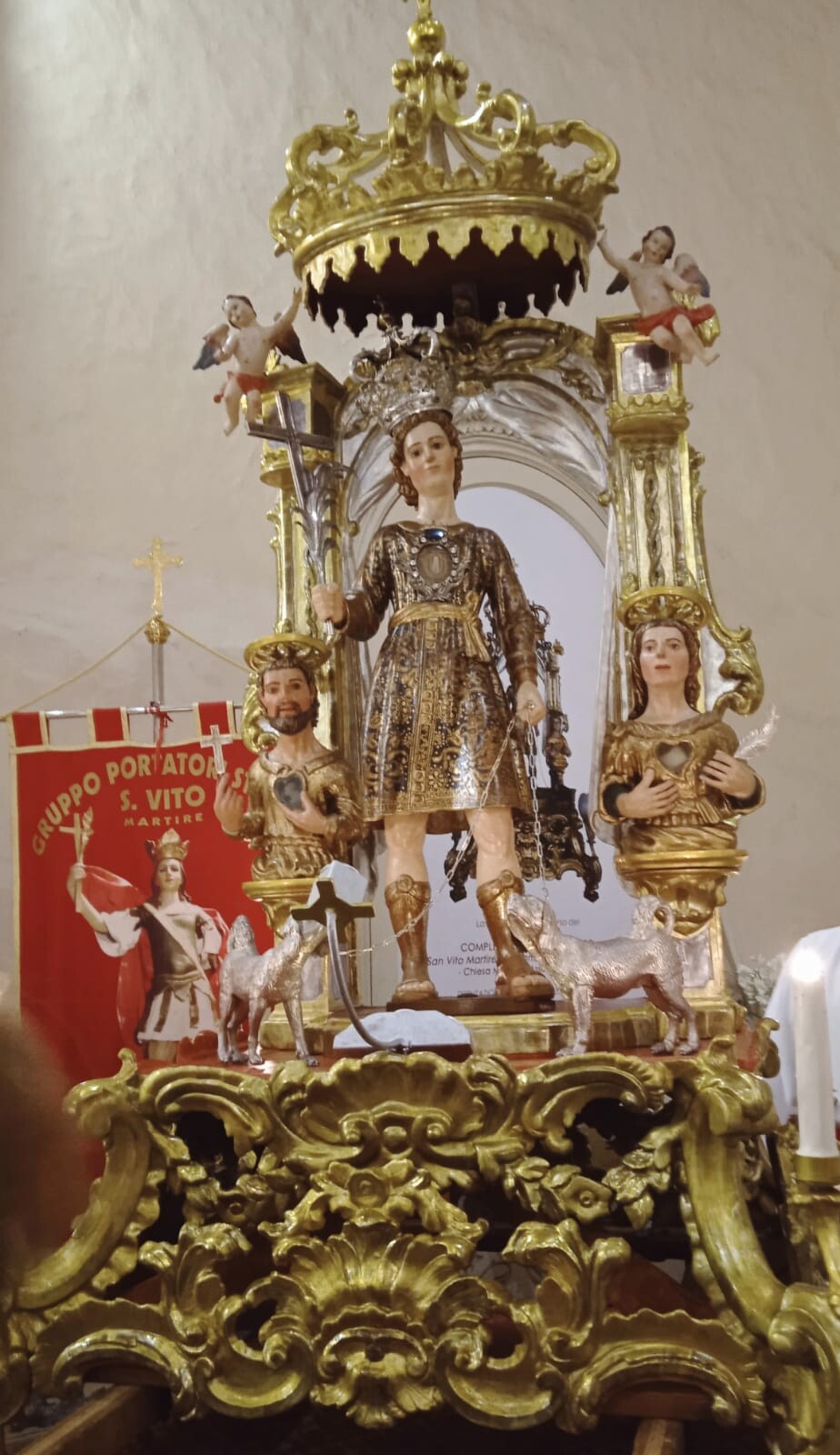 San Vito nacque in Sicilia, a Mazara del Vallo, verso la fine del III secolo d.C., in una famiglia patrizia pagana. Convertitosi al cristianesimo sin da giovane, fu perseguitato e torturato per aver rifiutato di rinunciare alla sua fede. Morì martire giovanissimo, secondo la tradizione, all’età di soli 12 anni, insieme ai suoi educatori Modesto e Crescenzia, durante le persecuzioni dell'imperatore Diocleziano. Il suo culto si è diffuso rapidamente in tutto il mondo cristiano, rendendolo uno dei “Santi Ausiliatori”, invocato contro malattie nervose, epilessia, morso di animali e per la protezione dai fulmini.